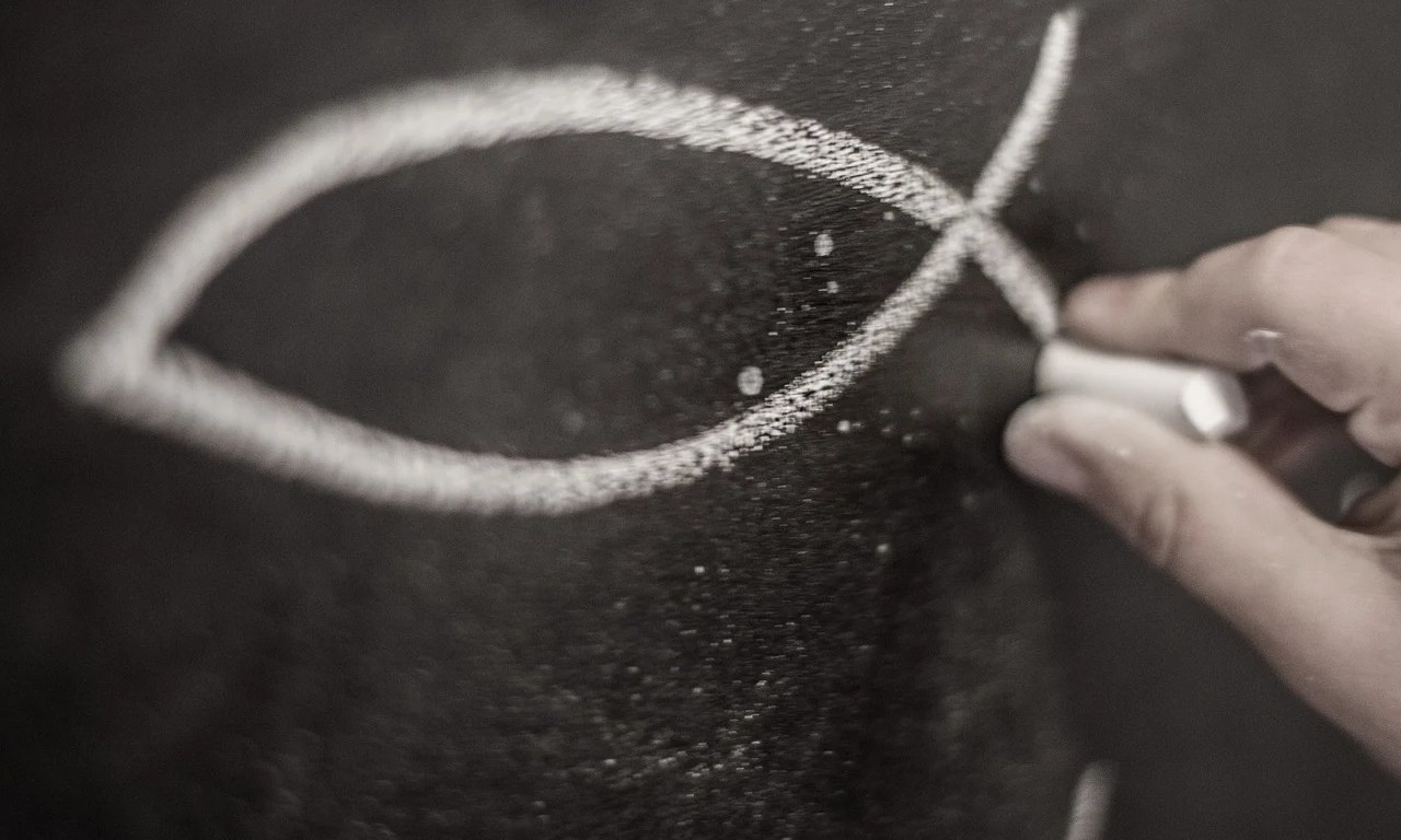 “The fish symbol let early Christians talk to each other without words. When a Christian met strangers, one would draw one-half of the outline of the fish on a rock or in the dirt. If the stranger drew the other half, both knew that they could freely share their belief in Jesus Christ. It’s called the ‘ichthus.'”